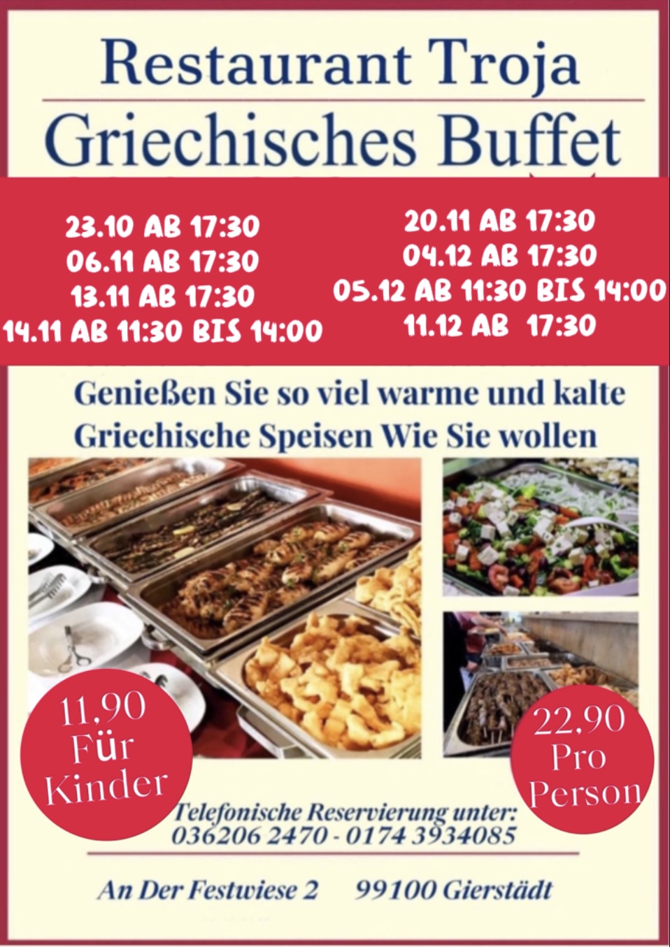 Willkommen im Troja, dem exquisiten griechischen Restaurant in Gierstädt! Tauchen Sie ein in die faszinierende Welt der griechischen Küche und lassen Sie sich von unseren traditionellen Speisen und herzlichen Gastfreundschaft begeistern. Entdecken Sie unsere umfangreiche Speisekarte mit authentischen griechischen Gerichten, zubereitet mit frischen Zutaten und Leidenschaft für kulinarische Perfektion. Von klassischen Vorspeisen wie Tzatziki und Dolmadakia bis hin zu köstlichen Hauptgerichten wie Souvlaki, Moussaka und Gyros ist für jeden Geschmack etwas dabei. Unsere Speisen werden mit traditionellen Gewürzen und Kräutern verfeinert, um Ihnen ein unvergleichliches Geschmackserlebnis zu bieten.